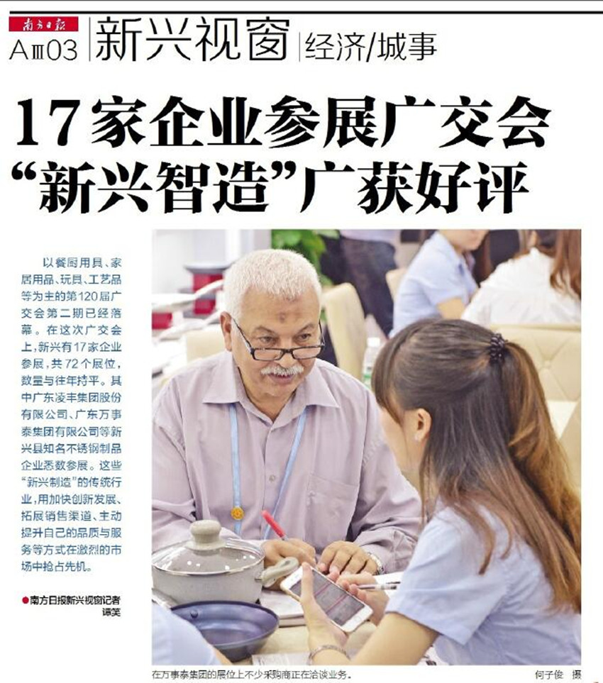以餐厨用具、家居用品、玩具、工艺品等为主的第120届广交会第二期已经落幕。在这次广交会上,新兴有17家企业参展,共72个展位,数量与往年持平。其中广东凌丰集团股份有限公司、天空网页版等新兴县知名不锈钢制品企业悉数参展。这些“新兴制造”的传统行业,用加快创新发展、拓展销售渠道、主动提升自己的品质与服务等方式在激烈的市场中抢占先机。