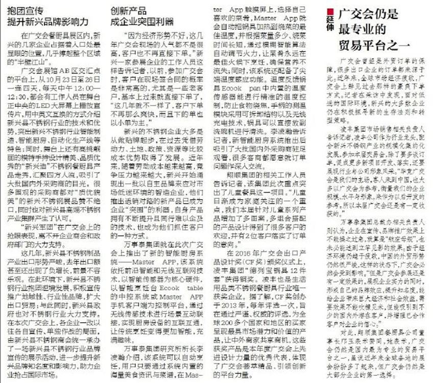 这几年,新兴县不锈钢制品产业出口形势严峻,去年出口额甚至还出现了负增长,前景不容乐观。在此环境下,新兴县不锈钢行业抱团逆境发展,积极宣传推广地域性、行业性品牌,扩大出口贸易;与此同时,新兴县政府也对不锈钢行业大力支持。在本次广交会上,各企业一改以往各自宣传、单独作战的局面,由新兴县不锈钢商会统一承办了一场新兴县不锈钢行业品牌宣传的展示活动,进一步提升新兴品牌知名度和影响力,助力企业抢占国际市场。