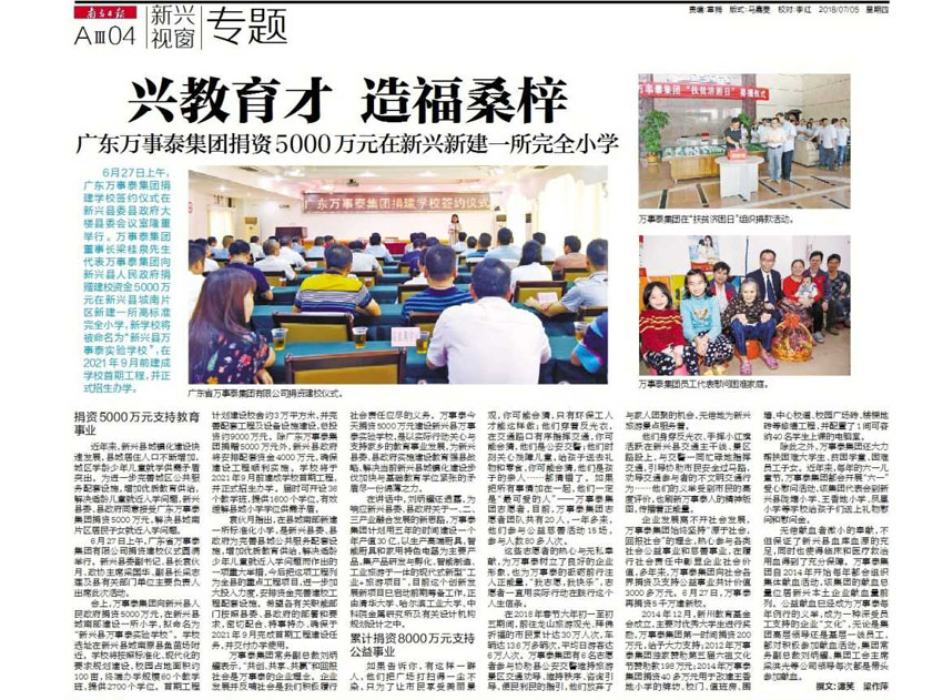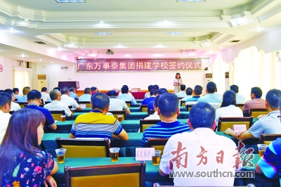 6月27日上午,广东万事泰集团捐建学校签约仪式在新兴县委县政府大楼县委会议室隆重举行。万事泰集团董事长梁桂泉先生代表万事泰集团向新兴县人民政府捐赠建校资金5000万元在新兴县城南片区新建一所高标准完全小学,新学校将被命名为“新兴县万事泰实验学校”,在2021年9月前建成学校首期工程,并正式招生办学。