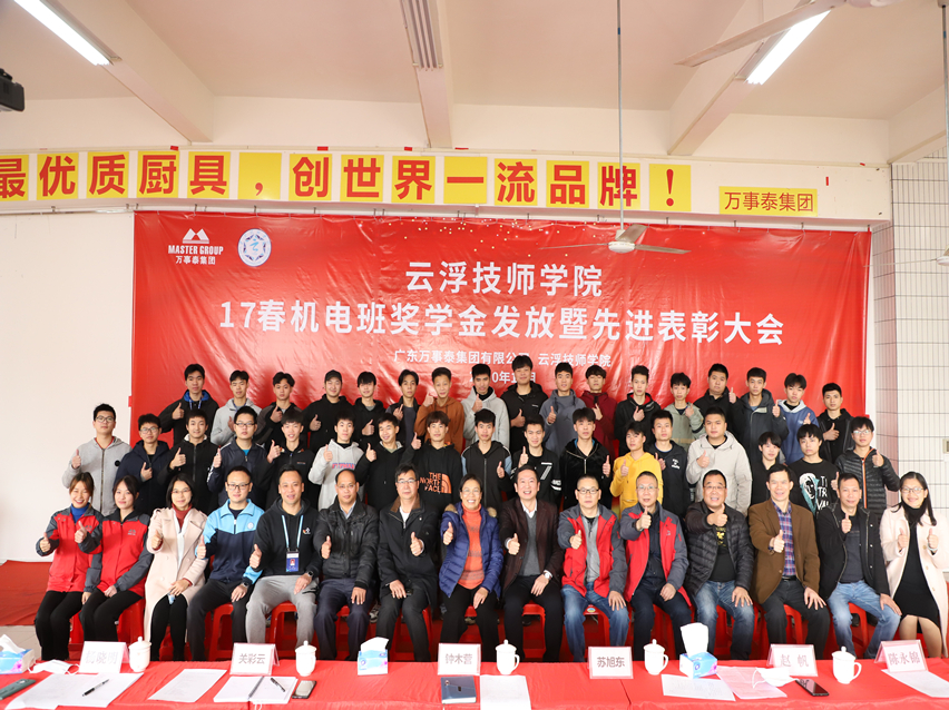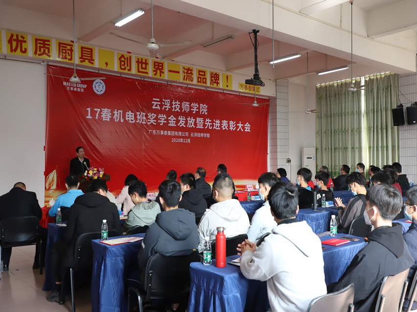 集团讯 为加强校企人才培养,表扬先进,树立典型,通过表彰先进学生,激励后进,引导学生刻苦学习、努力工作、德技并修。12月22日,云浮技师学院17春机电班奖学金发放暨先进表彰大会在万事泰总部三楼培训室顺利举行。万事泰集团厨具中心总经理钟木营、厨具中心副总经理苏旭东、人力资源中心副总监赵帆等集团领导出席,出席表彰大会的还有云浮技师学院党委书记杨晓明、副院长梁新林、先进制造系系主任冯文妍、校企合作办主任陈植辉等学院领导及17春机电高级班学生共计50余人。表彰大会由技师学院陈植辉主持。